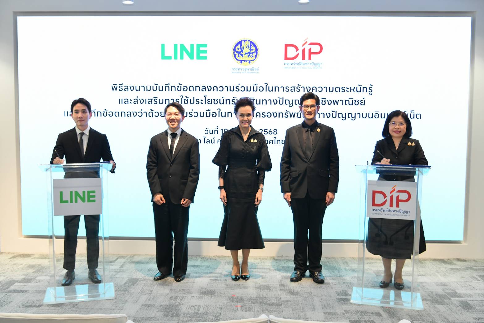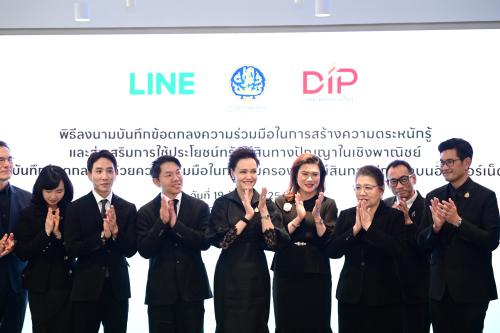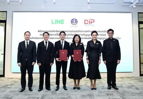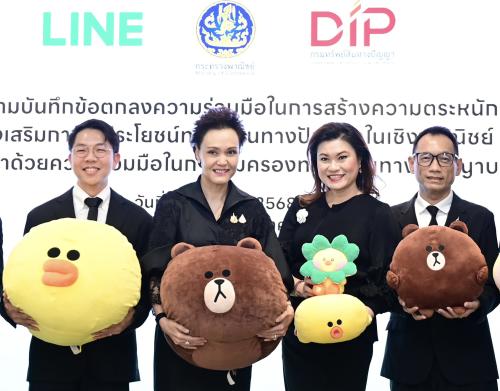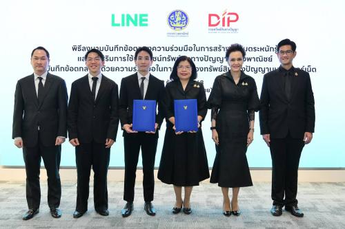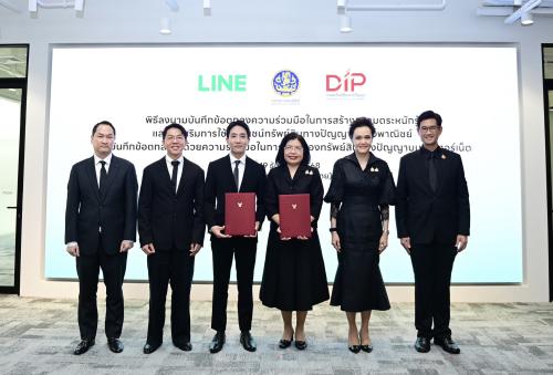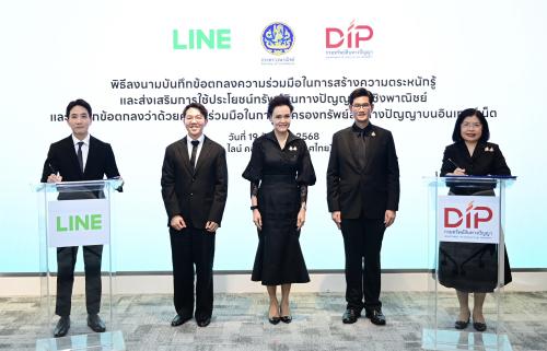 นางศุภจี สุธรรมพันธุ์ รัฐมนตรีว่าการกระทรวงพาณิชย์ และนายนรสิทธิ์ สิทธิเวชวิจิตร ประธานเจ้าหน้าที่บริหาร บริษัท ไลน์ คอมพานี (ประเทศไทย) จำกัด ร่วมเป็นสักขีพยานในพิธีลงนามบันทึกข้อตกลงความร่วมมือ (MOU) ระหว่างกรมทรัพย์สินทางปัญญา และบริษัท ไลน์ คอมพานี (ประเทศไทย) จำกัด เพื่อสร้างความตระหนักรู้และส่งเสริมการใช้ประโยชน์ทรัพย์สินทางปัญญาในเชิงพาณิชย์ ควบคู่กับการคุ้มครองทรัพย์สินทางปัญญาบนอินเทอร์เน็ต โดยเป็นการผนึกกำลังระหว่างภาครัฐและเอกชน เพื่อเสริมศักยภาพผู้ประกอบการไทยให้สามารถดำเนินธุรกิจบนแพลตฟอร์มออนไลน์ได้อย่างมีประสิทธิภาพ สอดรับกับพฤติกรรมผู้บริโภคและเศรษฐกิจดิจิทัลในปัจจุบัน เมื่อวันที่ 19 ธันวาคม 2568 ณ บริษัท ไลน์ คอมพานี (ประเทศไทย) จำกัด อาคารเกษรทาวเวอร์ กรุงเทพฯ